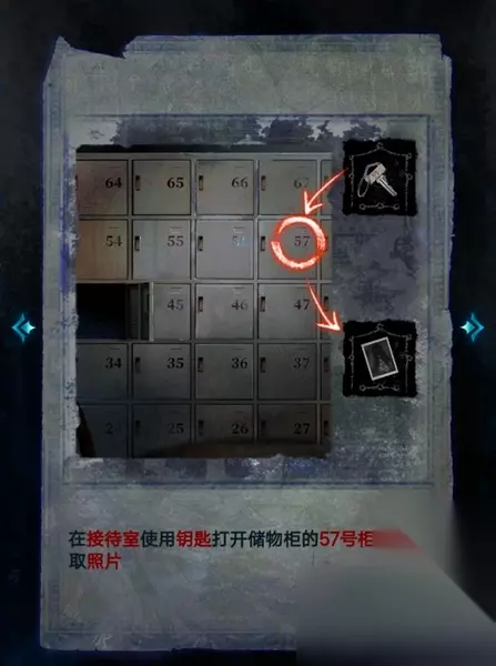 17、用钥匙打开接待室的57号储物柜,拾取其中的照片。