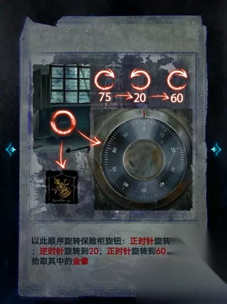 24、点击保险箱,先顺时针转到75°,接着逆时针转到20°,最后顺时针转到60°就可以打开保险箱获得金佛像。