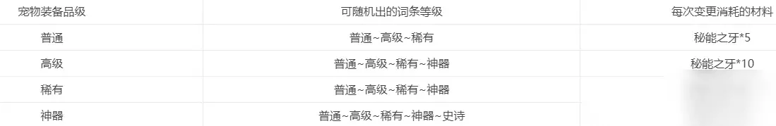 宠物词条每次变更需要消耗一定数量的秘能之牙,词条变更时,词条等级有几率提升,也有几率不变,但是不会下降 (秘能之牙获取目前获取难度非常大,只有两个获取方式:①分解宠物装备、②迷你商店购买) 宠物词条变更的时候除了等级会变,词条的属性也会随机变更,三个部位的宠物装备词条都是不一样的属性