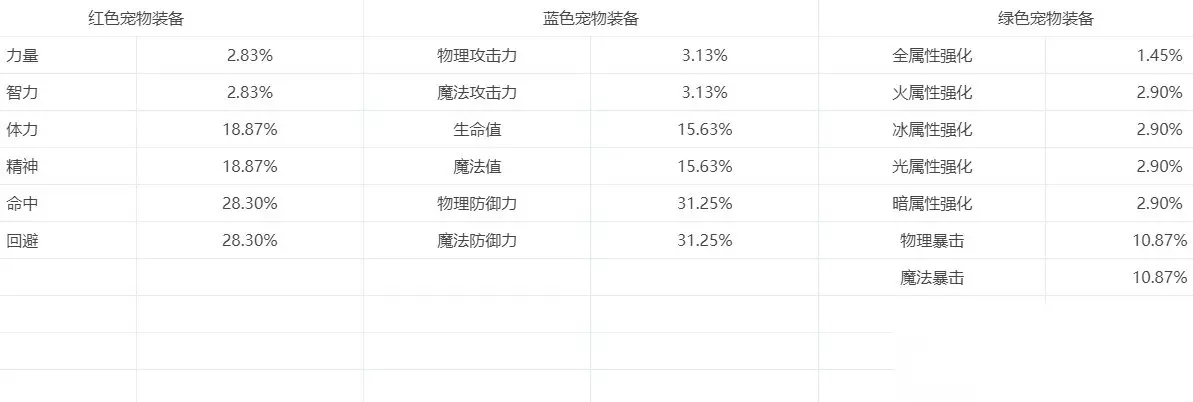 宠物词条的属性会根据词条品级变动,例如力量,史诗级词条是+30力量,神器级词条+25力量,稀有级词条+20力量,高级词条+15力量,普通词条+10力量 其他词条也是等级越高属性越好 【宠物装备词条毕业推荐】 红色宠物装备词条:物理职业选力量,魔法职业选智力 蓝色宠物装备词条:物理职业选物理攻击力,魔法职业选魔法攻击力 蓝色宠物装备词条:选择对应自身属性的属性强化或者全属性强化 【宠物装备怎么搞最划算】 平民