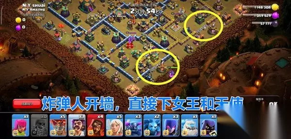 这次进攻分为两个阶段,第一阶段就是“天女加滚木车”的组合,这就避免了两线操作带来的手忙脚乱,在发起进攻前我们首先用“超级炸弹人”在6点钟“投石炮”的区域炸开城墙,并且在上方4点钟方向“天鹰火炮”的区域也炸开一块城墙,前期的准备工作完毕。 女王正对着城墙的缺口释放就可以了,小伙伴们不要害怕女王会走偏,因为这个阵型的外层建筑的距离很远,所以女王清理完外面的建筑以后,就会自动的往“投石炮”的方向前进,前戏的要点是:释放完女王以后,马上释放天使,并且马上要用狂暴法术覆盖女王和天使,提前找到“英雄猎手”做好准备,只要和敌方的女王交火“英雄猎手”就要上去补刀,确保女王不被“投石炮”和敌方“女王”集火。