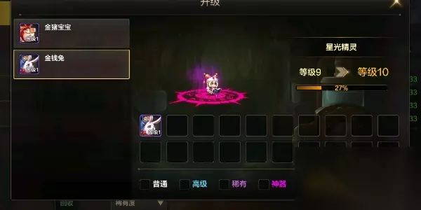 二、宠物品质 宠物可以分为五个品质,普通、高级、稀有、神器、史诗。品质越高所升级的难度也会越大,宠物等级越高所有需要的材料也越多。 三、宠物经验获取 1、从趣味夺宝中抽经验宝宝可以作为升级材料,宠物本身也可以作为升级材料。