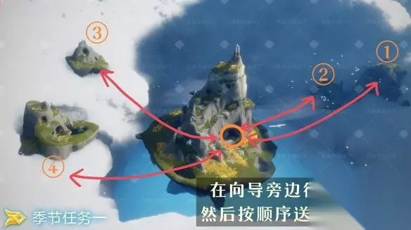 光遇风行季第一个任务怎么完成?光遇风行季已经正式解锁了,这个季节也会有新的季节任务,接下来就和小编一起来看看目前第一任务的相关攻略。 光遇风行季第一个任务怎么完成 一、任务攻略 1、首先玩家从雨林右侧的云洞进入,找到里面的风行先祖; 2、然后去向导先祖处领取任务,在光圈处打坐开启第一个任务; 3、第一个任务就是把蜡烛送到右侧岛屿上面的修补匠。 一共四个先祖,位置如图,依次给四个先祖送蜡烛,即可完成任务。
