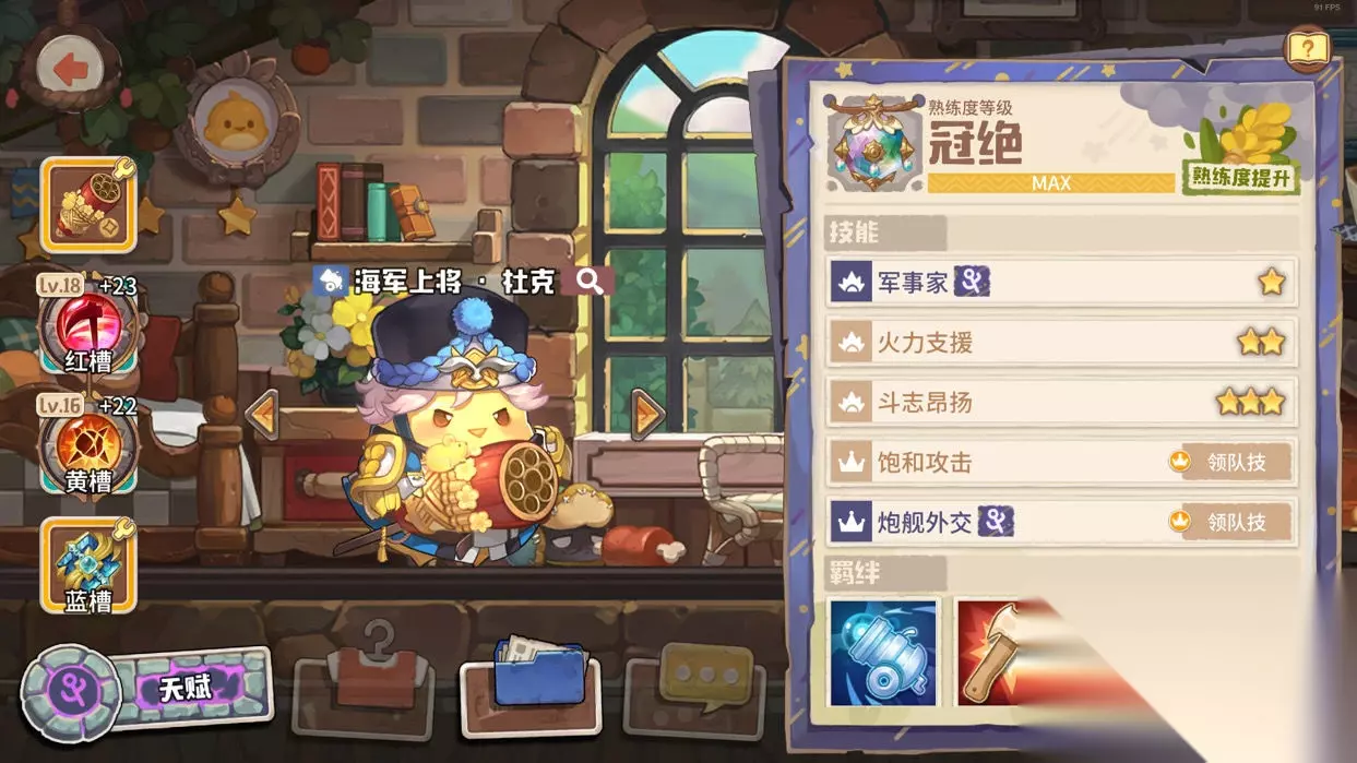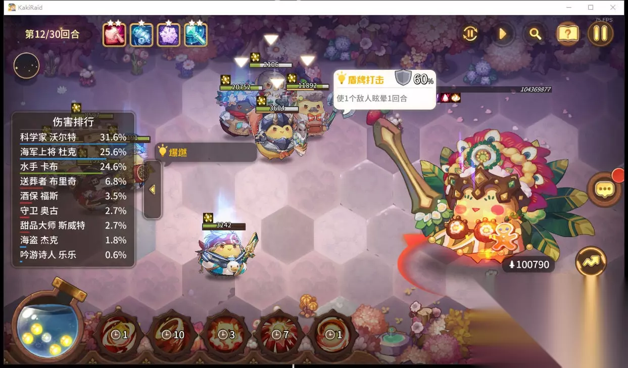杜克,海洋四少中的大哥,也是我队伍的主c之一。面对单独敌人时,他能稳定打出巨量伤害,轻松秒杀各种小怪和BOSS!被动军事家可以让咔叽在后期多回合的战斗中,拥有额外的伤害提升(也可以直接配初始能量精华)。同时作为战争女神羁绊的拥有者,配合近战组圣物英灵勋章,可额外为远程组提高50%伤害! 武器我选的是黄金十二响,宝石方面则是克己+焦热诅咒,完美地把输出最大化,第三个槽位最好的选择是至上。 给大家安利一下十二响,十二响的输出虽然稍稍逊于地核炮,但在功能性上远优于地核炮!伤害方面会比地核炮低10%,但地核炮的减命中在多回合对战中很吃亏,而十二响的燃烧则是优势。