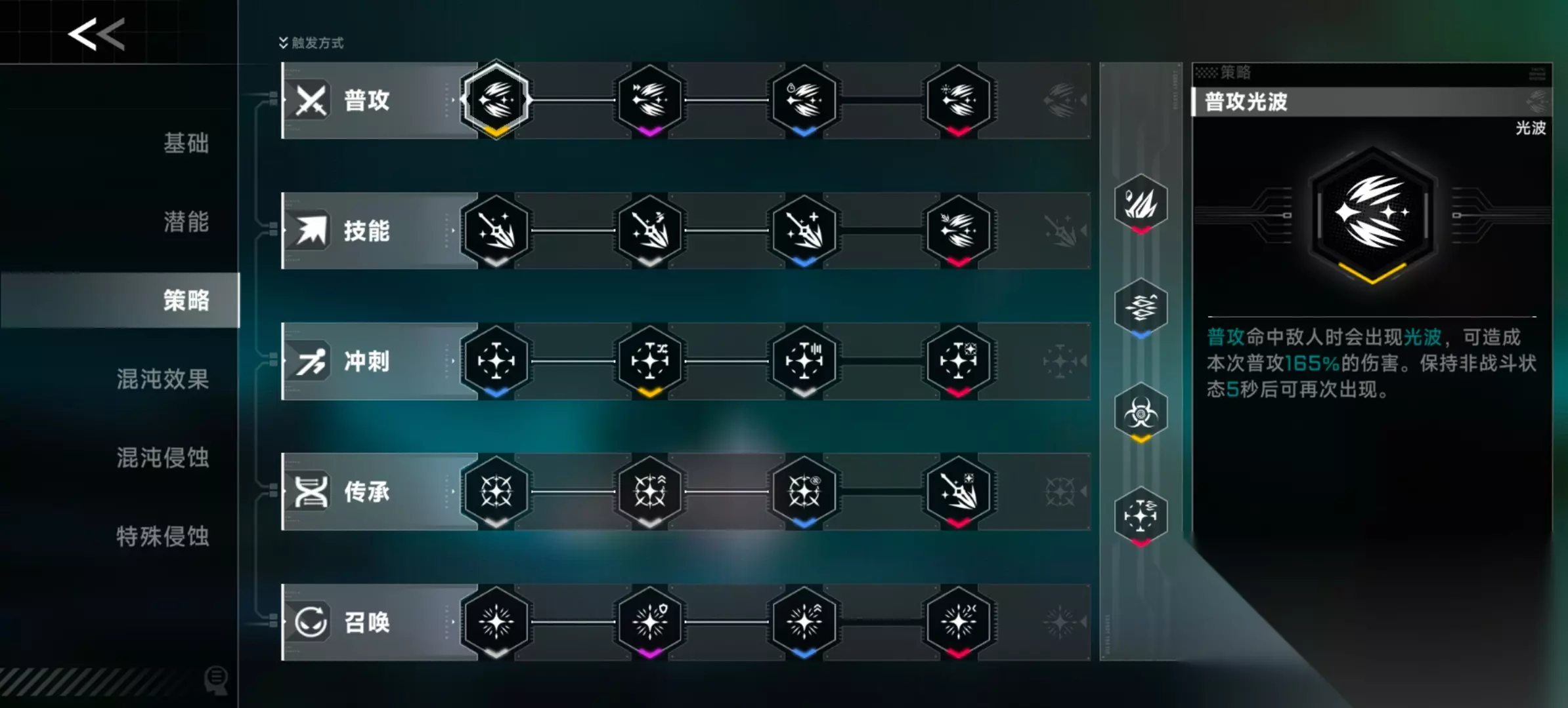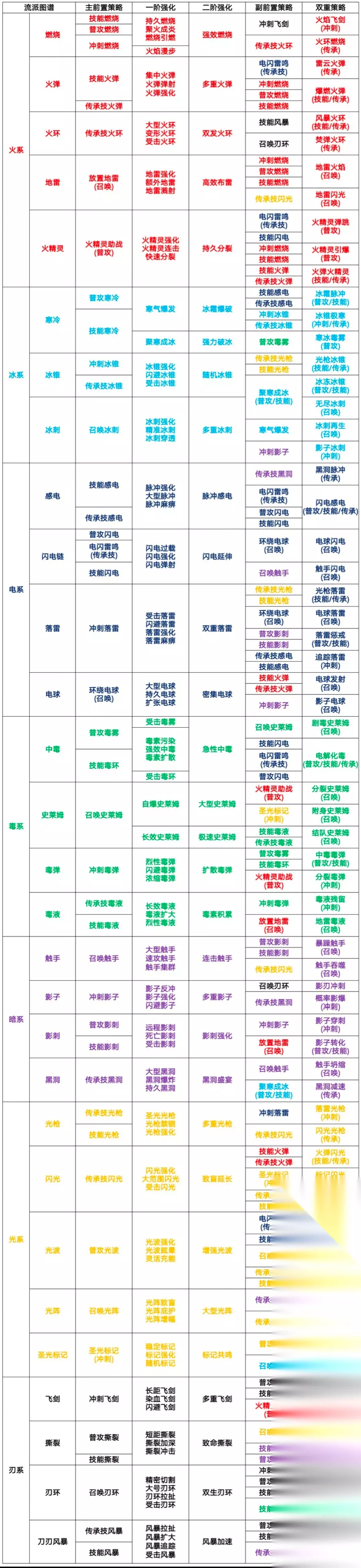 策略共7系,分别是火/冰/电/毒/暗/光/刃 通过携带对应的意识结晶可以提高某系策略出率 角色共5个触发位:普攻/技能/冲刺/传承/召唤 每个触发位从左到右的策略分别为: 前置策略→一阶强化→二阶强化→双重策略 【前置策略】前置策略大部分包含了触发位名称,但放置地雷(召唤)/火精灵助战(普攻)/电闪雷鸣(传承)/环绕电球(召唤)/圣光标记(冲刺)不在此列,同触发位的前置策略可以替换但不可共存,同流派的多个前置策略只能选其一。 【一阶强化】强化策略是针对前置策略的强化,一阶强化有多样性但只能选其一,大部分一阶强化不会被前置策略影响也不会影响二阶强化,但火焰漫步/受击毒雾/受击毒环受前置策略影响,寒气爆发/聚寒成冰/自爆史莱姆/长效史莱姆会影响二阶强化,一旦前置策略被强化就不可再替换。 【二阶强化】二阶强化也是针对前置策略的强化,因此强化策略必定与前置策略同系,大部分二阶强化有唯一性且不会影响双重策略,但冰霜爆破/强力破冰/大型史莱姆/极速史莱姆不在此列,同样二阶强化即使有多选也只能选其一。 【双重策略】双重策略一般由两个前置策略来触发,但冰冻冰锥/无尽冰刺/冰刺再生/黑洞减速却需要一阶强化寒气爆发/聚寒成冰作为前置,大部分双重策略名称不包含触发位,但影刃冲刺/召唤回旋刃不在此列,只有双重策略是红色品质,其他策略有白/蓝/紫/金四种品质,一旦选择双重策略,对应两个前置策略就不可再替换。 【传承策略】传承策略是开局选择的两个数据体所带来的,传承策略如果是前置策略会直接填入触发位,如果不是则需要有对应前置才会填入触发位,此外传承而来的双重策略即使没有空位,只要两个前置策略凑齐也可以触发。 综上所述,策略搭配的冲突主要是前置策略和双重策略的触发位冲突,而游戏中的流派图谱主要起到引导效果而不能有效排查触发位是否冲突。 参考帖的那位老哥是把红策触发位和前置策略都列了个表,但我觉得还是不方便,且策略分支的触发位不明晰,所以自己重新制了一张表,将触发位直接备注在名称不包含触发位的策略处。