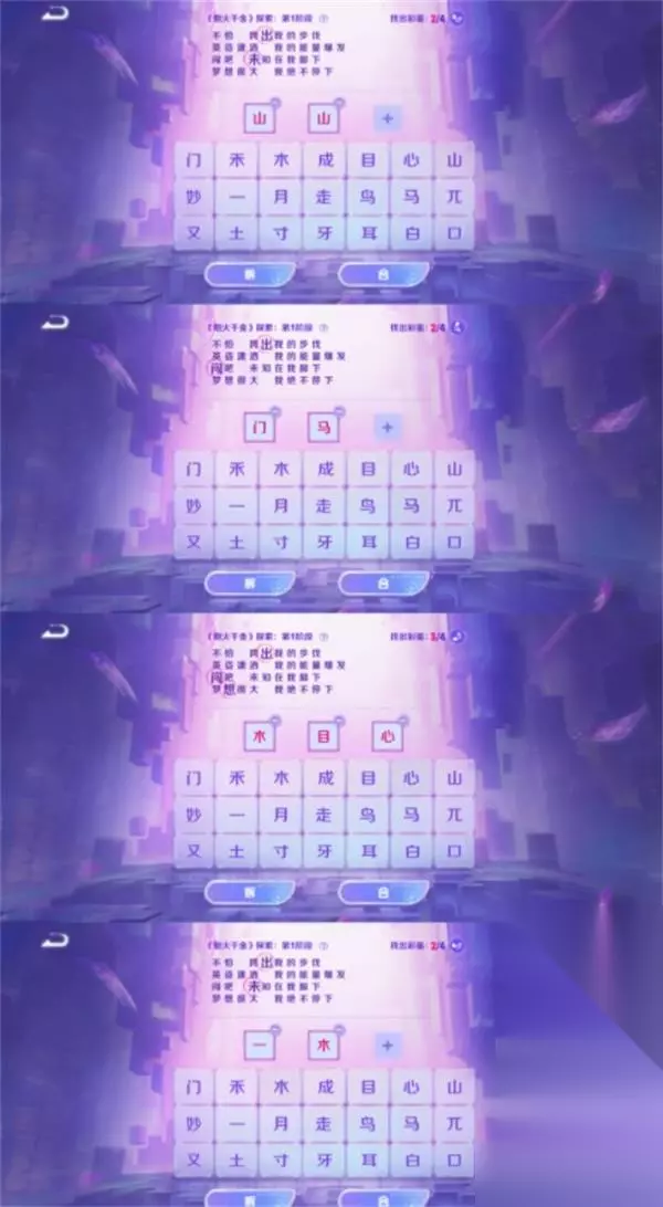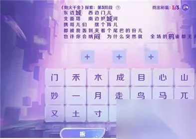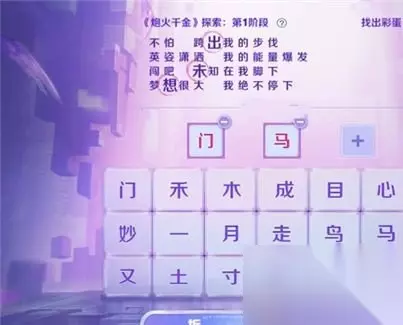 王者荣耀这款多模式的竞技手游,深受不同年龄段玩家的喜欢,不断的更新新的游戏版本,增加新的游戏内容和玩法,还有各种日常任务实时更新,最近比较受关注的是炮火千金探索活动,相信很多玩家都不了解答案,下面小编为大家进行答案分享,有需要的玩家可以前来了解! 王者荣耀炮火千金探索全部阶段答案详情一览 音你闪耀-炮火千金: 1、活动的探索玩法主要是选字组合或者拆分成歌词当中的一个字。 2、探索活动中有4个阶段,每个阶段的答案是不同的,完成可以得到奖励。 如下: 第一阶段答案:出,闯,未,想