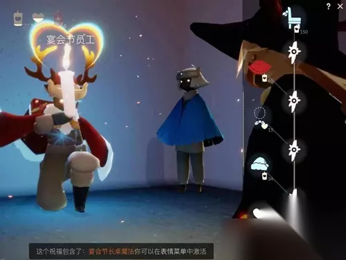 光遇圣诞节椅子怎么获得 1、首先需要进入禁阁办公室,门外有个npc会拉你进去。 2、到了办公室可以看到小蓝npc,它的旁边会出现一名宴会节员工。 3、点击宴会节员工进行对话,解锁树状图,就能使用150根白蜡烛兑换圣诞节椅子。