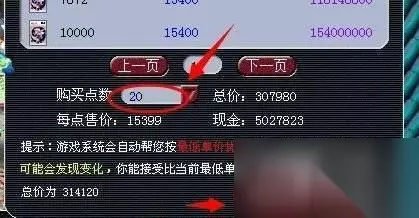 4,这里大家看到的就是点卡的价格,比如第一个就是15399游戏币=1点卡,第二个就是15400游戏币=1点卡,然后在下面的红框内输入要购买的点数。