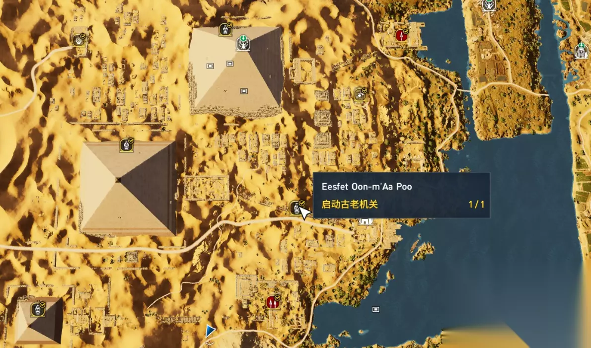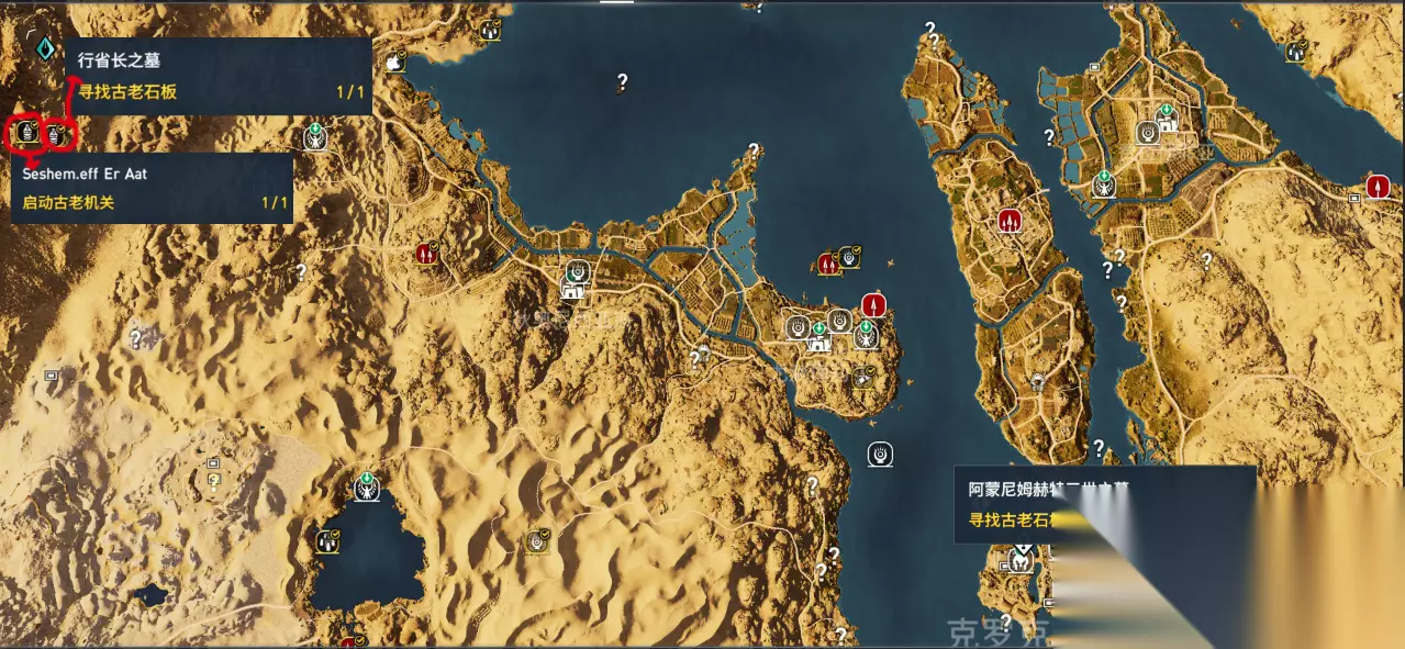 根据上图不难看出,这一地区又有三个古墓可供玩家探索,其中斯门卡拉之墓内,还有一个名为Eeyoo Sekedoo Aat的古老机关。实际全部解锁你会发现,很多内容都是挨着的,只是大多玩家没有前期解开迷雾,往往与邻近的内容失之交臂。这个地区在大屋行省,找也很方便,大家在整体地图的最右侧海边往下拉,找到如图的河道就不难找到这个区域了,右上角黄色边线就是游戏的最右侧边境区域,很容易对比找寻。 注:该场景内最左上方还可以找到行省长之墓,来到附近的玩家参考第七节。 5:赛特·阿娜特之墓以及Qeneb too Kah`Aiye古老机关