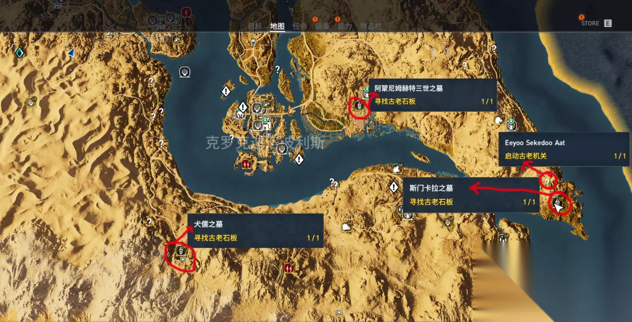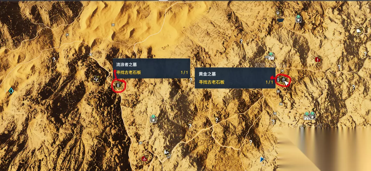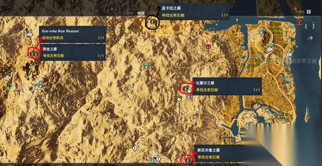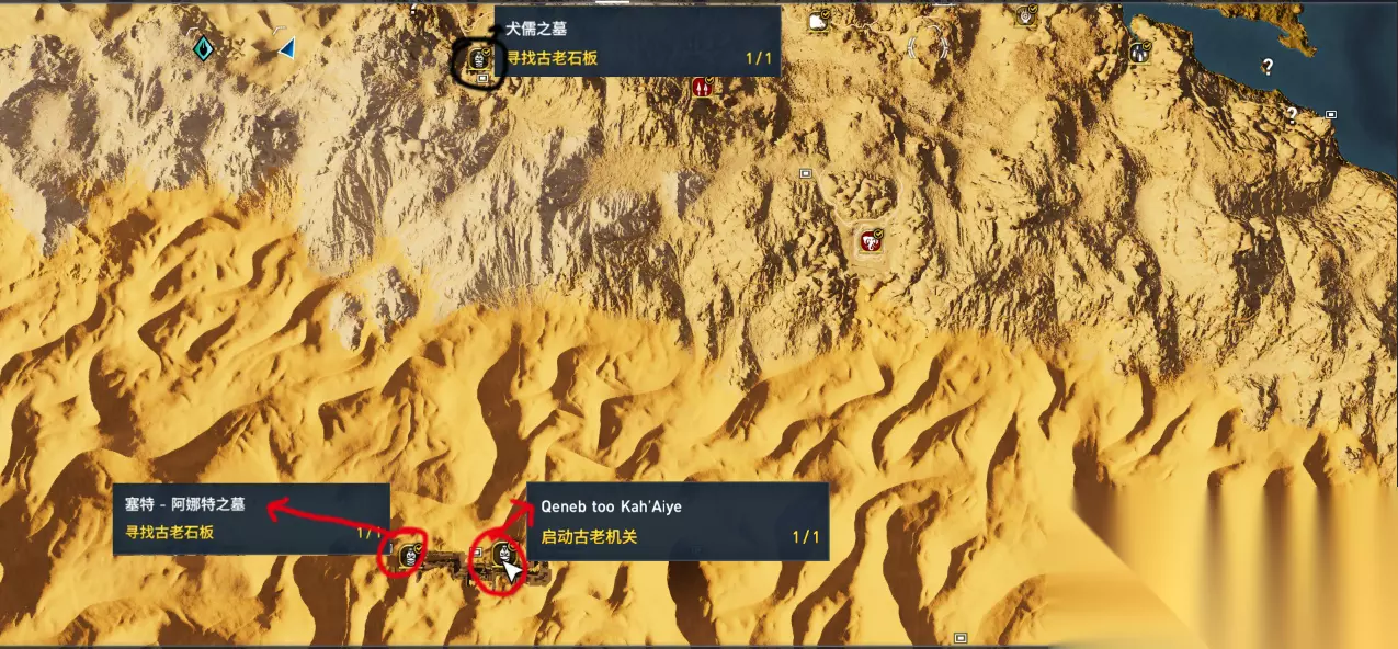 这张图里同样标注了三个古墓的位置 截图的最上方中间位置,笔者圈黑的地点,是上张配图中最下方的孟卡拉之墓,由此不难看出,在孟卡拉往下拉就可以找到三个全新的古墓了。红色圆圈圈出了该区域的三个古墓,而左上方的黄金之墓需要特别说明一下,这是古墓探索中,唯一两个含有古老机关的古墓之一,这个古老机关就在墓内,因此探索完古老石板后,一定要去顺便开了古老机关(消耗5个硅石),否则以后你解锁伊述盔甲会遇到麻烦哦。 注:这个图片内,黄金之墓左侧翻过山丘有流浪者之墓,在附近的玩家可以参考第六节。 4:阿蒙尼姆赫特三世之墓、犬儒之墓、斯门卡拉之墓及Eeyoo Sekedoo Aat古老机关