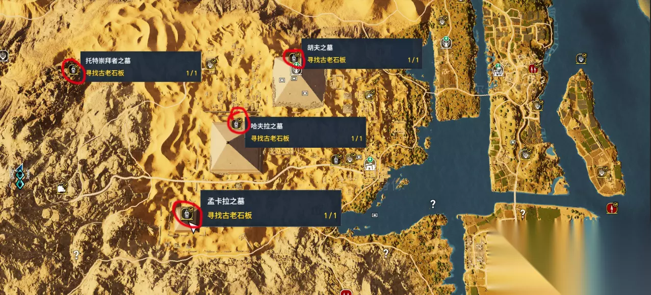 亡者山墓所在位置 为了让大家体验游戏的探索乐趣,这里就不给大家介绍具体怎么探索了,不然剧透严重。古墓的探索玩法,主要是找寻硅石和古老石板,注意古墓内黑暗处有没有深入下去的通道,以及墙体有没有可以打破的缝隙,或者能够挪动的机关,镜子反射,以及升降台帮助跳跃即可,基本出不了这几种方法。亡者山墓就在锡瓦,是新手村第一个墓,很容易找。 2:孟卡拉、胡夫、哈夫拉金字塔及托特崇拜者之墓