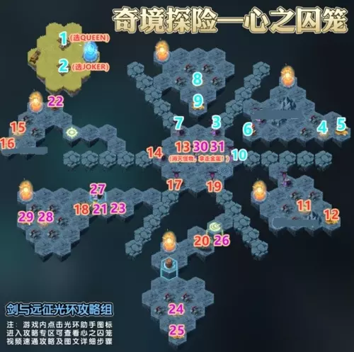 剑与远征心之囚笼怎么过 1、起始阶段,在1号位置的营地获取第一个新虚空英雄,将其加入战斗阵容。 2、移至2号位置,再次从营地招募第二个新虚空英雄,强化你的战斗团队。 3、进入传送门,到达3号位置,成功击败此处的怪物阵营。 4、直接来到4号位置,收集“心声”这一重要资源。 5、继续前进至5号点,领取相应奖励。 6、在6号位置操作火炮设施,以消灭下方的怪物阵营。 7、接下来在7号位置,清理当前的怪物敌人。 8、到达8号点,再次获取“心声”资源。 9、在9号位置获取另一份奖励。 10、在10号点,对抗并战胜敌方怪物阵容。