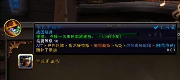 魔兽世界市民军旅哨玩具如何获取 一、获取条件概览 市民军旅哨获取方式: 完成成就【模范市民】