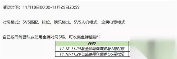 1、活动时间:11月18日00:00-11月29日23:59 2、对局模式:5V5匹配、排位、娱乐模式、5V5人机模式、全民电竞模式