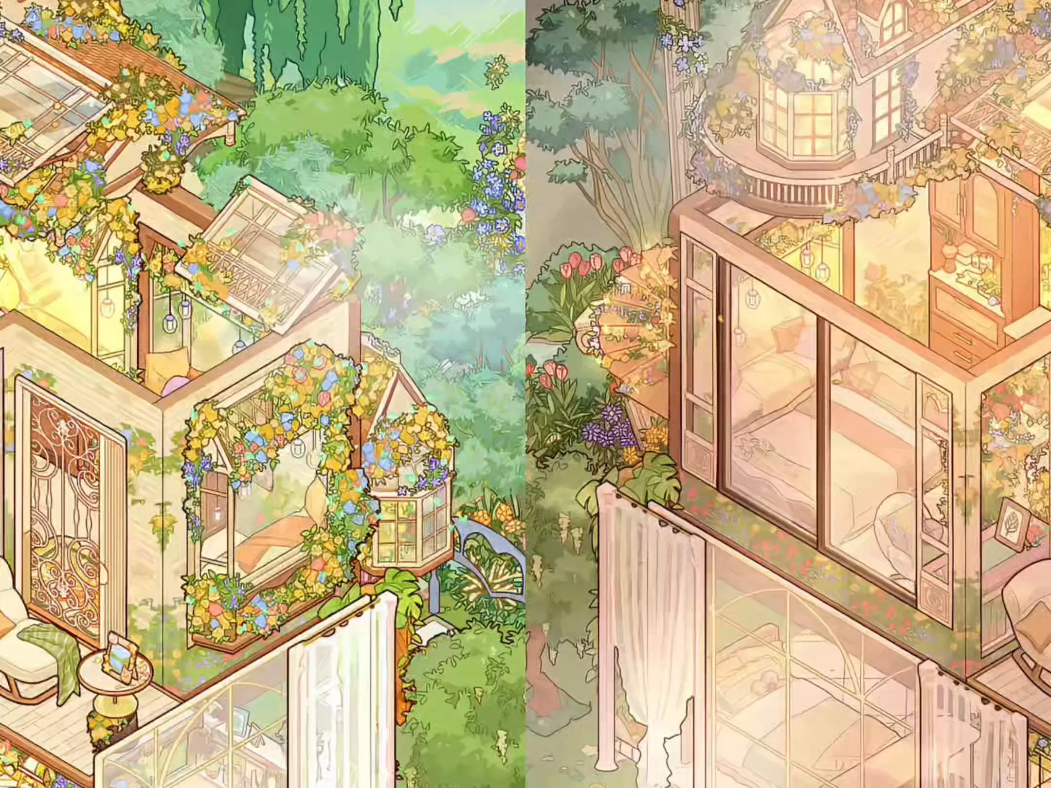 这是手游《我的休闲时光》里的护眼治愈系小别墅装修1.0版内容,展示了小别墅不同空间的装修过程,包含家具、摆件等的布置,呈现出清新治愈的装修效果。