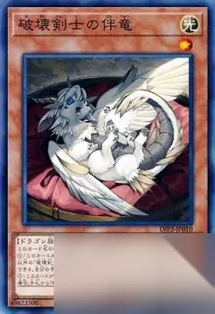 「破坏之剑士」+龙族怪兽这张卡不用融合召唤不能特殊召唤。①:这张卡不能直接攻击。②:这张卡的攻击力·守备力上升对方的场上·墓地的龙族怪兽数量×1000。③:只要这张卡在怪兽区域存在,对方场上的龙族怪兽变成守备表示,对方不能把龙族怪兽的效果发动。④:这张卡向守备表示怪兽攻击的场合,给与攻击力超过那个守备力的数值的战斗伤害。 拥有丰富的支持卡,在冠以自己名字的卡组【破坏剑士】中,作为主力攻击手兼融合素材·同步素材活跃。可以用《龙破坏之证》搜索,