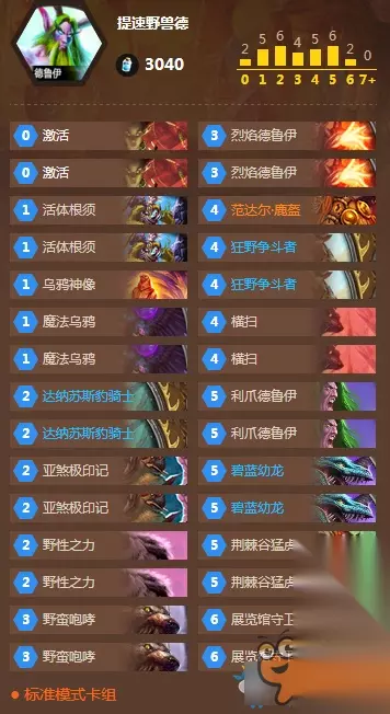德鲁伊: 数量很多的青玉德,起手留乌鸦、豹骑士、烈焰德、狂野争斗者、鹿盔、激活等,前期只管铺场,按费拍怪,解场交给对面兄弟就好了,4费没牛可以丢鹿盔,随便解,我们的鹿盔没那么大的收益,我们只要场面!5费拍怪老虎最佳,6费只要守卫能接上,场面将无限优势,随便一个咆哮对面就起飞。对面太胡的情况也是可以打的,不放弃就有希望。