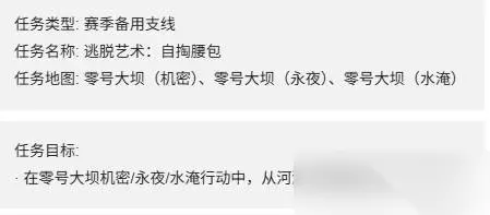 二、任务详情 1、任务类型:赛季备用支线 2、任务名称:逃脱艺术:自掏腰包 3、任务地图:零号大坝(机密)、零号大坝(永夜)、零号大坝(水淹)