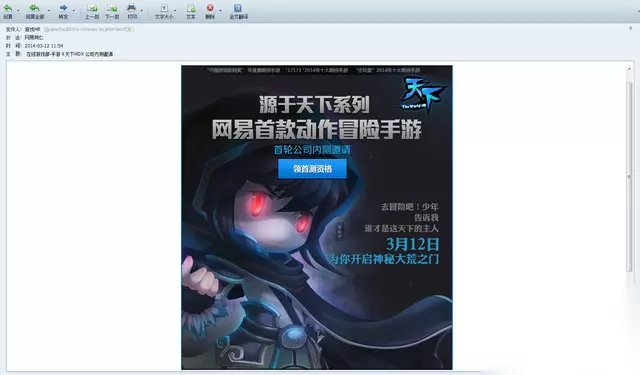 近日,小编从从网易内部人士得知,旗下首款动作冒险手游《天下HD》已经在公司内部悄然开启了首次测试。从邮件中我们可以看到,天下系列的经典人物玉玑子正召唤少年们一起前往神秘大荒冒险!据透露,此次公司内测放出的100个激活码在不到20分钟便被一抢而空,其在网易内部受关注的程度可见一斑。