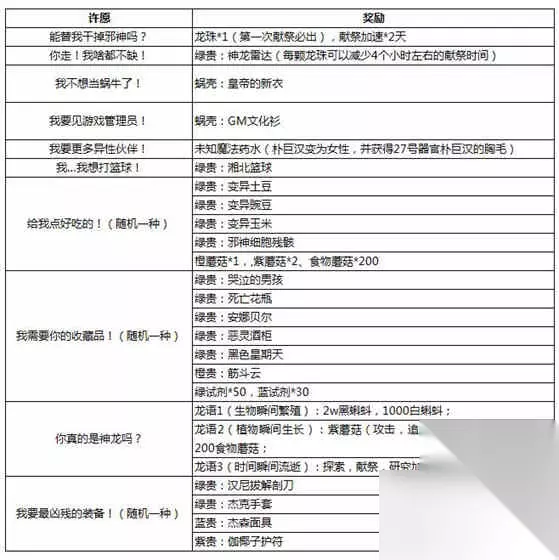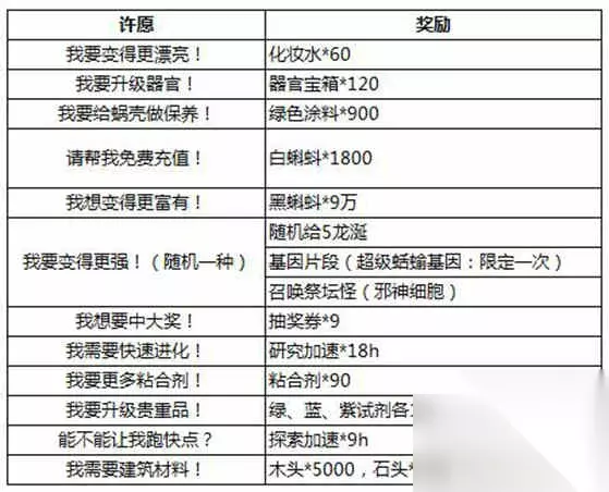 最强蜗牛龙珠许愿攻略第5、10、15、16、20次召唤神龙会触发神龙剧情,因此很多玩家想知道最强蜗牛龙珠许愿怎么选?小编为您带来最强蜗牛龙珠许愿攻略图一览。 最强蜗牛龙珠许愿攻略图一览 注:许愿只会出现一次的就归为限定类了;第5、10、15、16、20次召唤神龙会触发神龙剧情,具体奖励见表格。 一、限定类: 注:许愿“能替我干掉邪神吗?”第一次必出龙珠,优先推荐大家选择这个!