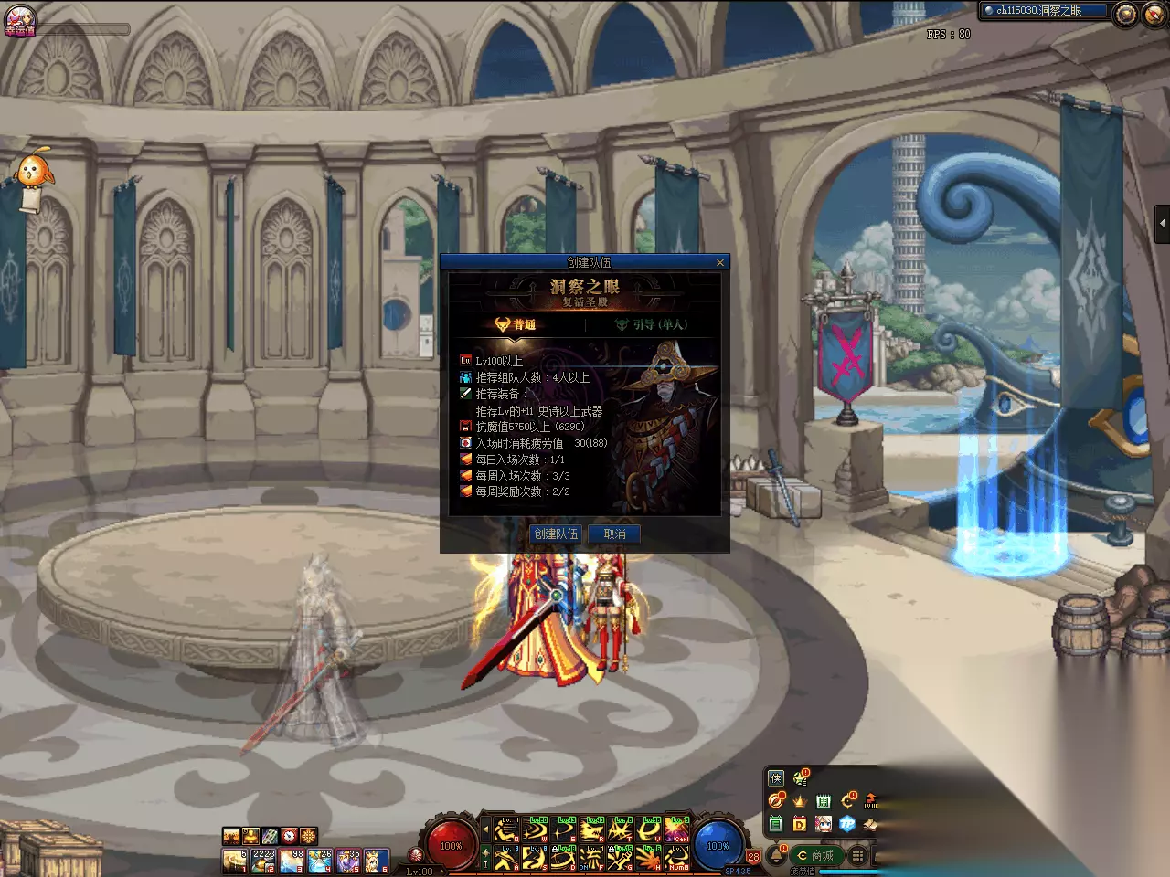 然后就能进入到洞察之眼副本入口了,由于副本难度较高,所以需要组队,创建队伍,召集四个角色之后才能进入副本。