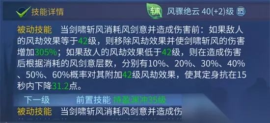 2.这里有一个概念,叫风劫。具体意思指的是在叠剑气之后放出的第一下剑啸斩风有几率上一个风劫的状态(90级技能被动); 有一个很迷惑的点在于所有技能都没有说明如何触发风劫,在这个技能的后半句写了如果风劫效果低于42级(42级指的是当钱技能等级,风劫等级只有0级和当前技能等级)则套一个42级风劫效果。 没有风劫效果就是风劫0级,这样第一下剑啸斩风就会给目标套一个风劫效果。