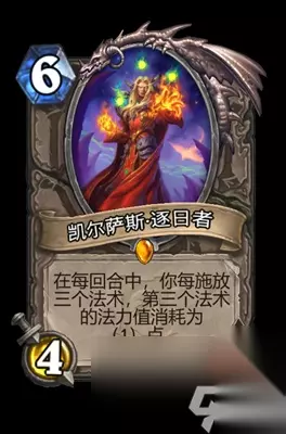 在《炉石传说》中,凯尔萨斯·逐日者作为一张中立传说随从牌,自外域的灰烬卡包加入游戏后,其费用设定为6点水晶,并拥有4点攻击力和7点生命值。最近的更新中,这张卡牌在保持6费不变的同时,其能力描述得到了更新:在每轮游戏中,当你释放三个法术时,第三个法术的法力值消耗将降至仅需(1)点水晶。