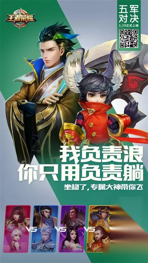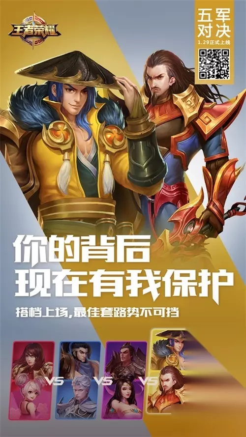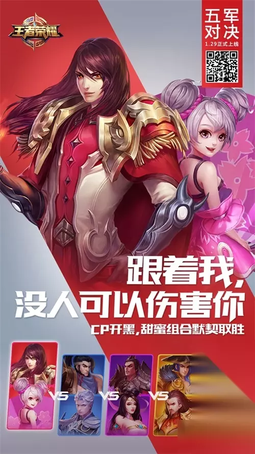 在新地图中,召唤师可尽量考虑优先击杀星星比较多的队伍,这样获取的分数也更高。 当自己队伍分数落后时,注意走位和策略,多围剿高星的敌方英雄,可以瞬间扳回劣势。多阵营对抗新玩法,春节开黑全靠它!呼朋唤友一起来吧! cp开黑,新年新地图玩法多多 在五军对决的模式下,二人组队开黑,玩家可以和恋人、小伙伴、大神等一起体验各种cp组合,在早前,《王者荣耀》官方就曾推出一套CP海报,为大家带来五军对决开黑的新姿势。 跟着我,没人可以伤害你。甜蜜组合可是靠默契取胜的。