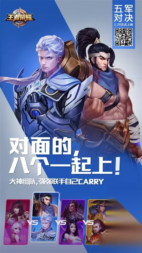 号令五军,我领风骚。新春新玩法,五军对决带给你全新体验。新的一年里,除了五连绝世,《王者荣耀》给你一个八杀的机会。倒数四天,让我们一起期待新玩法的上线吧! 【五军对决介绍】 打破红蓝双方的格局,为大家带来五阵营混战新玩法,每个阵营两人。五个阵营在战场中争夺资源获取经济,击杀其他阵营的英雄可以获取星星。关卡倒计时固定为8分钟,第8分钟时,根据阵营星星数量排名,本地图不存在胜利和失败,只会按照第一至第五排序。多阵营对抗新玩法,春节开黑全靠它!呼朋唤友一起来吧! 【小编推荐】专区入口 || 视频站入口 || 体验服申请入口 || 全民竞猜赢好礼 【新英雄爆料】| 司马懿 || 瑶 || 孙策 || 新英雄:囚徒/书圣/瞬 | 【新皮肤爆料】| 李白团战皮肤:敏锐之力new || 诸葛亮团战皮肤:掌控 || 典韦穷奇皮肤 Hot!! | 王者荣耀最新攻略 赛季段位继承表 每日一题 边境突围玩法攻略 体验服爆料