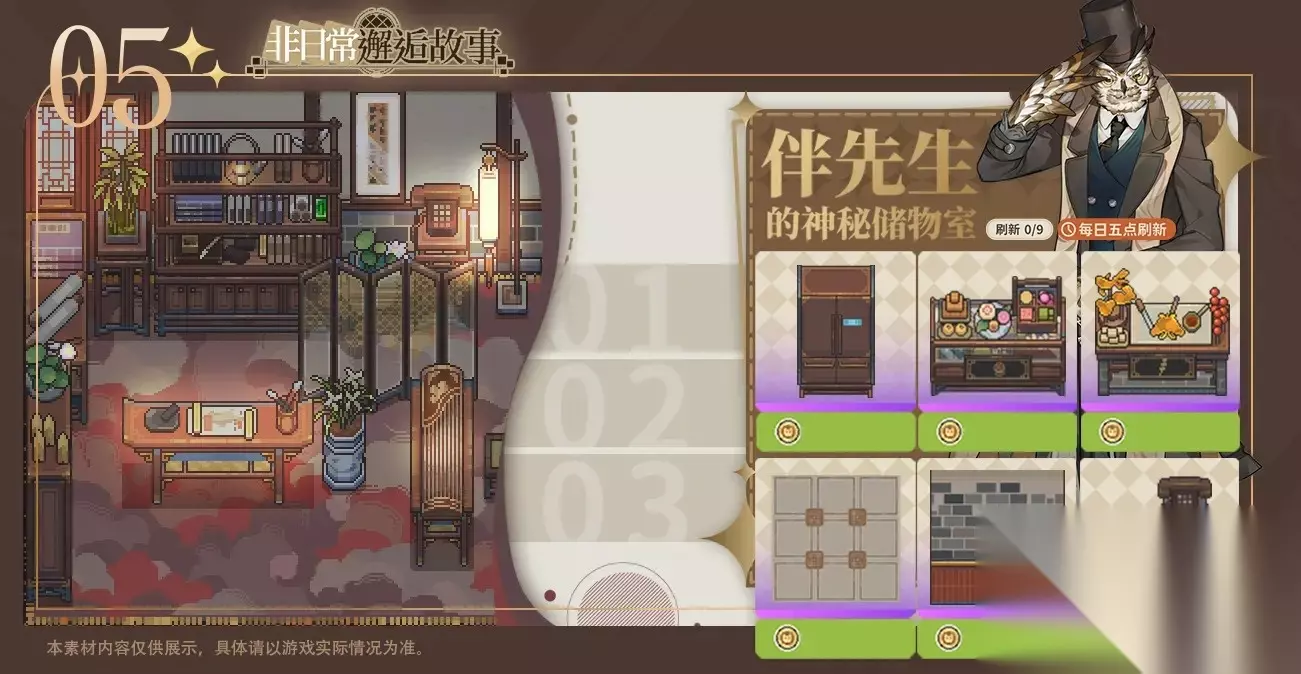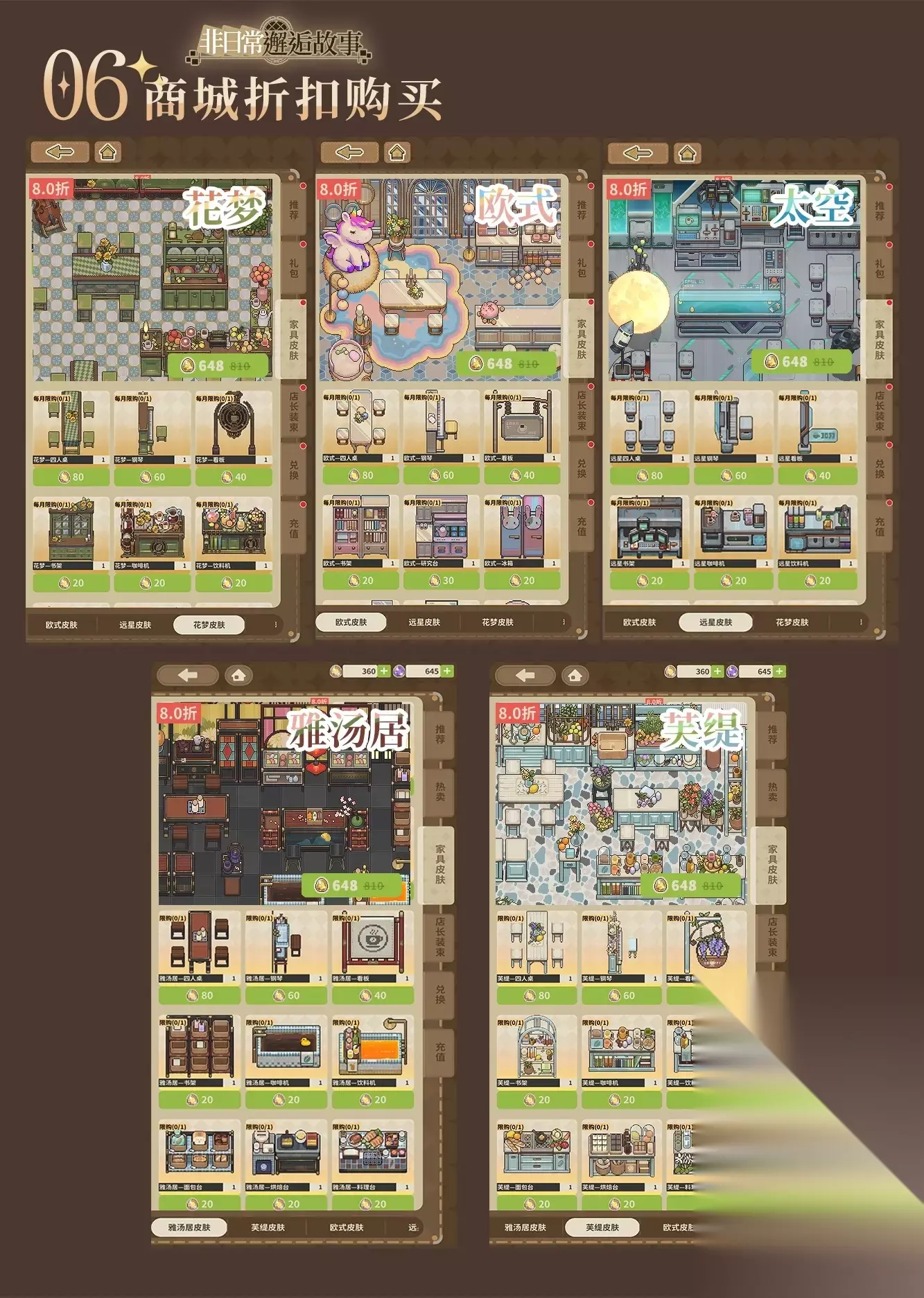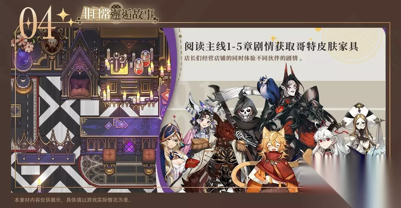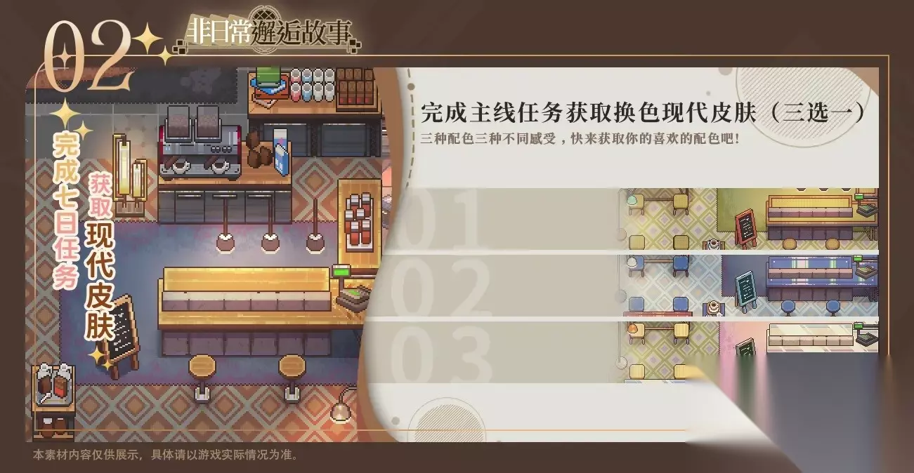 《非日常邂逅故事》是一款二次元重剧情像素风经营手游,由四川倍乐汀网络科技有限公司运营。 玩家在游戏中意外接手一家神秘的咖啡馆,开始接待来自不同世界的客人,逐渐揭开咖啡馆的过去。 游戏融合了模拟经营、剧情冒险和社交元素,玩家可以通过经营店铺获取资源, 解锁各种风格的家具和皮肤,扩建咖啡馆,并与不同世界的角色建立深厚的感情纽带。 非日常邂逅故事家具获取指南 1. 工业皮肤家具: 冒险足迹点获取 2. 现代皮肤家具: 完成七日任务和主线任务获取现代皮肤家具以及自选现代皮肤家具(开启自选现代皮肤可选择一种现代皮肤家具颜色) 3. 和风家具皮肤: 完成灵光旧愿订单即可获取和风家具皮肤 4. 哥特家具皮肤: 完成主线任务可获取哥特家具皮肤 5. 商城购买家具皮肤: 五种家具皮肤开启售卖!人民币与叶脉石兑换比例为:1:10。