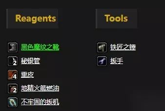 需要工具:铁匠之锤、扳手 需要素材: 黑色魔纹之靴x1、秘银管x2、地精火箭燃油x2、重皮x4、不牢固的扳机x1 学习等级:工程学225 学习自:在贫瘠之地(62.7,36.3)和塔纳利斯(52.5,27.3)处学习。