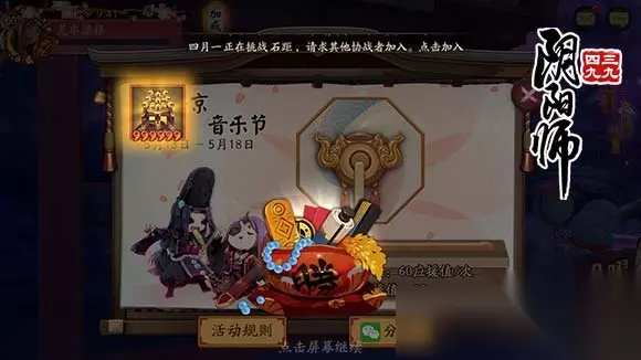 在庭院左侧灯笼处点击“音乐节”灯笼,出现如图界面,通过微信分享及好友应援获得应援值,可以进行抽奖,摇动上面的拉环即可,每次消耗60应援值,奖励包括音乐结界卡、奉为达摩和神秘的符咒等随机奖励。 音乐节奖励有哪些?音乐结界卡有哪些? 4~6星炼妖琴:除经验外,每小时可随机获得【花鸟卷、妖琴师、妖狐、椒图、提灯小僧、唐纸伞妖、跳跳妹妹、跳跳弟弟】其中之一的碎片x1。 4~6星千年笛:除经验外,每小时可随机获得【辉夜姬、桃花妖、樱花妖、管狐、天邪鬼绿、涂壁、跳跳妹妹、跳跳弟弟】其中之一的碎片x1。 4~6星神乐铃:除经验外,每小时可随机获得【一目连、般若、青坊主、蝴蝶精、天邪鬼赤、赤舌、跳跳妹妹、跳跳弟弟】其中之一的碎片x1。 4~6星天雷鼓:除经验外,每小时可随机获得【两面佛、镰鼬、清姬、跳跳哥哥、天邪鬼黄、灯笼鬼、跳跳妹妹、跳跳弟弟】其中之一的碎片x1。 4~6星绵绵冰:除经验外,每小时可随机获得【阎魔、孟婆、判官、山兔、天邪鬼青、盗墓小鬼、跳跳妹妹、跳跳弟弟】其中之一的碎片x1。 其他奖励: 白达摩、红达摩、5k金币、10k金币、20k金币、10勾玉、20勾玉、30勾玉、蓝票、白票 音乐结界卡怎么用最好? 这里主要建议大家不要直接用,因为直接用收益太低,一堆没用的N、R卡碎片一点用都没有,就算运气好抽的几个SSR碎片,但离成卡还远得很,所以建议大家拿 “高星的音乐结界卡”和两个1星合成,将其变异成高星太鼓(勾玉)、斗鱼(体力)或室内伞(金币),更赚! 如转载涉及版权等问题,请作者与我司联系,我司将在第一时间删除或支付稿酬。