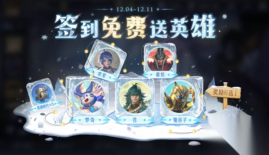 精选英雄自选宝箱:打开后可选择以下奖励之一:蒙恬、梦奇、鬼谷子、苍、弈星、英雄碎片x5 蚩姹-极光幻客皮肤上架