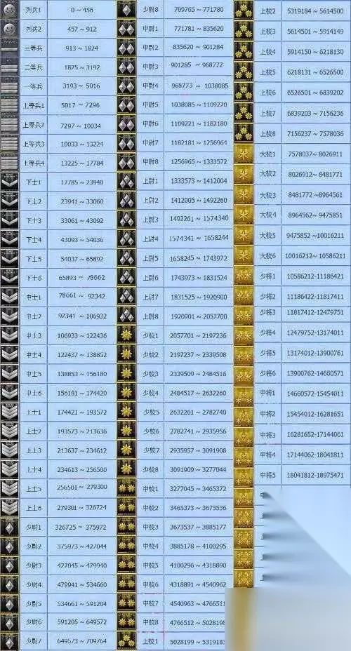 手游中升级军阶所需的经验跟端游是一致的。从表中可以看出升上等兵需要5017经验,升下士需要17785经验,升中士需要174421经验,升少尉需要326725经验,升中尉771781经验,升上尉1333573经验,升少校2057701,升中校3277045经验,升上校5028199,升大校7578037,升少将10586212,升中将14660572,升上将19945612,升元帅26564451。 要升元帅,需要的经验非常之恐怖,并不是一朝一夕能够做到的,需要玩家的日积月累。好了,今天为大家带来的军阶数据表就到这里。愿各位玩家早日进阶元帅,拿到奖励。