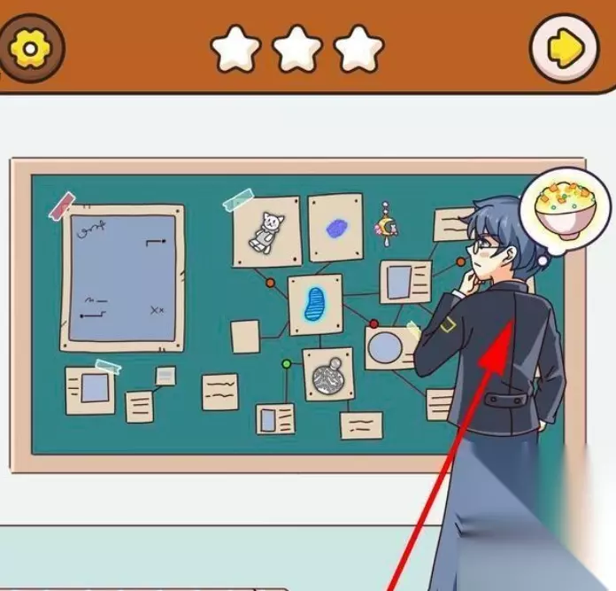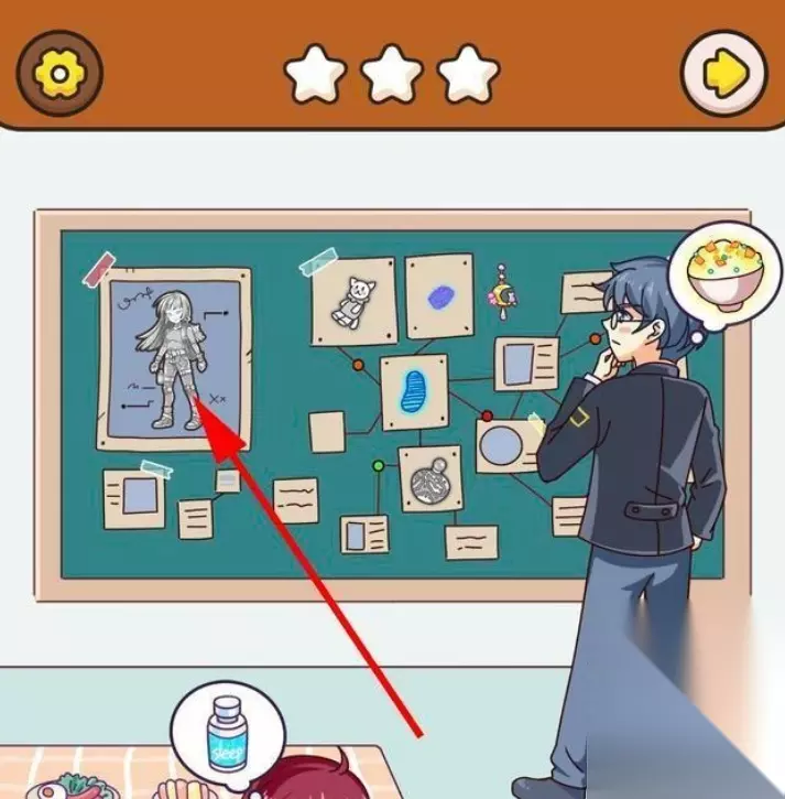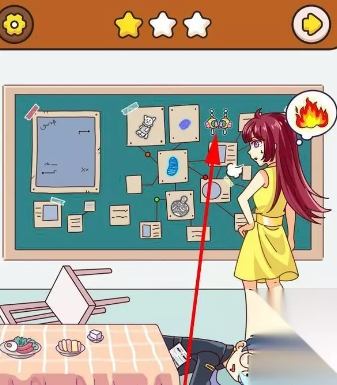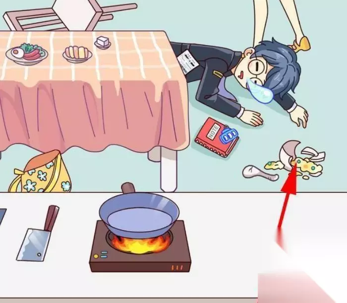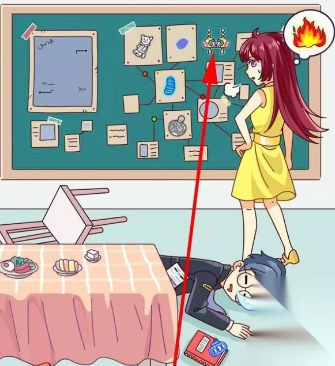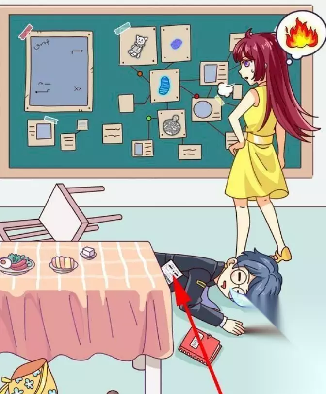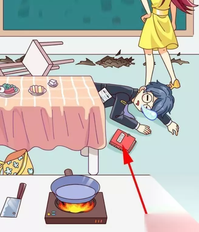 3、然后再将盘子里剩下的菠萝倒入锅中,将锅中做好的炒饭拖动给调查员,调查员吃了下药的炒饭睡着了,点击地上打碎的碗,得到第三件物品。 4、将女主耳朵上的耳环,拖动到黑板上另外一只耳环旁边凑成一对,点击耳环即可获得第四件物品。 5、将锅下面的火拖动到黑板上,火会将黑板上的纸都烧毁,点击地上的灰,这是我们要找的第五件物品。 6、点击调查员兜里的双色球彩票,彩票大多都被黑色遮住了,只有3个数字比较清晰。点击地上的笔记本,输入刚才双色球彩票上的三位数039。