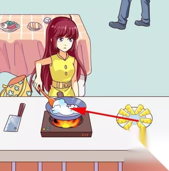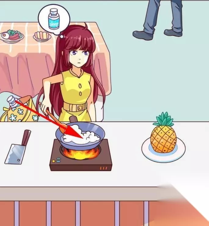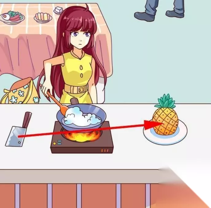 2、拖动女主书包里的药瓶到锅里,拖动菜刀到菠萝上,将菠萝切开,切开后点击菠萝做成的两只小白兔,这是我们要找的第二件物品。