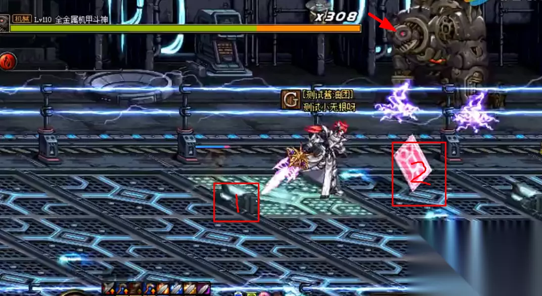 被弹开的玩家需要跑过整个电流场破坏发电机才可以攻击; 在跑动图中注意走位,不能碰到图中1所示的滑块,否则会被弹回起点,并吃了图中2处一红一篮的能量晶块可破除防御;