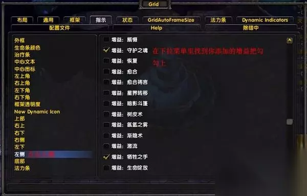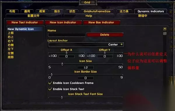 显示在什么位子,在什么位子显示什么 切换到指示标签下设置 6.0以后GridIndicatorCornerIcons和GridIndicatorSideIcons(2个边角图标显示器模块)都不能使用相信很多以前使用GRID的玩家都很郁闷现在我们可以用GridIndicatorsDynamic这个模块来实。 具体设置如下 这个模块相比以前你可以完全自定义你要显示的图标,色块,文本在框体上的任何位子和个数 进入Dynamic Indicators标签 在这个标签下第一个是文本,第二个是图标,第三个是色块 比如我要完美复刻以前装两个图标显示器的样子设置如下 点击Icon Indicator标签 在左侧则显示出一个新的图标标签你可以编辑如图