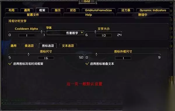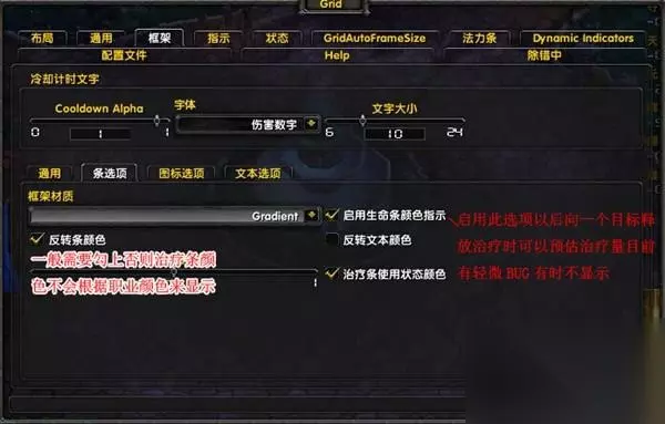 相信还是有着很多的玩治疗职业的玩家在使用GRID团队框架来进行加血或者治疗。这里我们来进行一些简单的GRID插件的设置讲解来让对插件不是非常了解的玩家有一些认识。 设置 很多人谈到设置可能感觉GRID设置太繁琐但是只要你找到方法基本就不难了 (1)基本设置框体的设置: 所谓框体就是你想把框体显示成什么样子最简单的就是多长多宽 那就是框架 在grid里选择框架选项首先确定框架的主题显示状态(注意这个标签下所设置的都是中心:比如图标指的是中心图标)