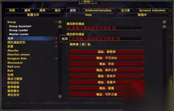 这里设置中心文本 (2)下面来介绍你想把什么东西显示在框体的什么部位 首先你要有GridIndicatorsDynamic6.0以后更新的模块 不管什么设置我都把它方法分为2步: 你想显示什么: 首先切换到状态标签下然后在光环下面添加你要显示的BUFF DEBUFF (要注意你要监视的状态显示在BUFF还是在DEBUFF栏位比如减伤烟雾弹是减益)