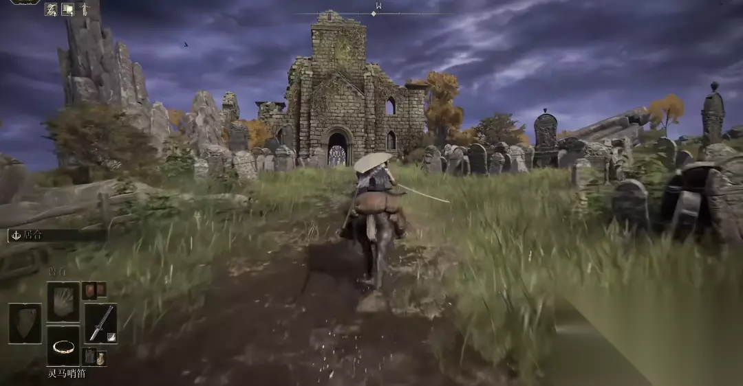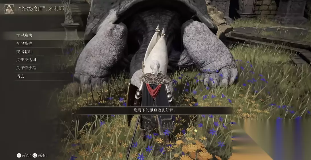 结缘教堂的建筑外观较为显眼,是一个白色的圆形结构,坐落在水域之中,周围环绕着断裂的石桥。教堂内部中央设立着用于赎罪的雕像,右侧摆放着一个宝箱,里面存放着黄金缝衣针和黄金裁缝工具,左侧则有一位名叫米利耶的巨型乌龟,它可以教授玩家一些魔法与祷告。