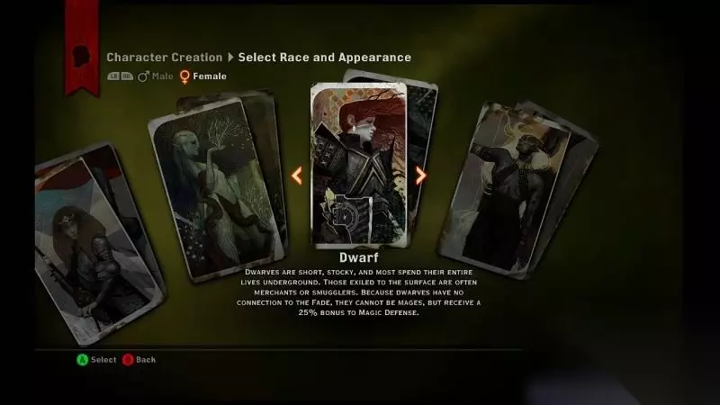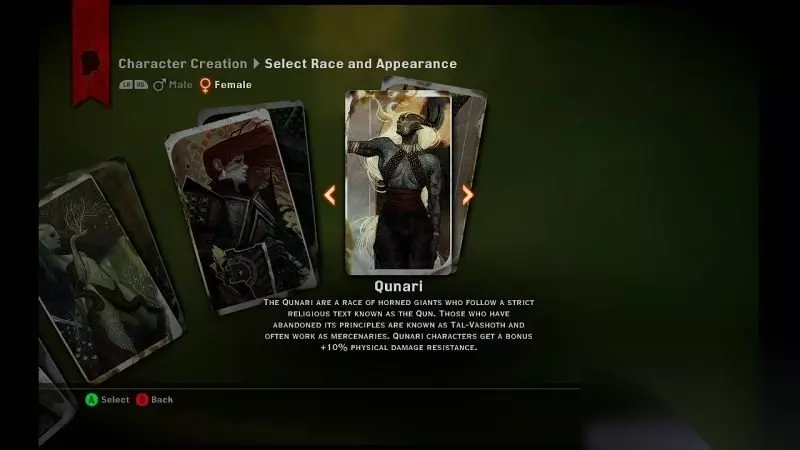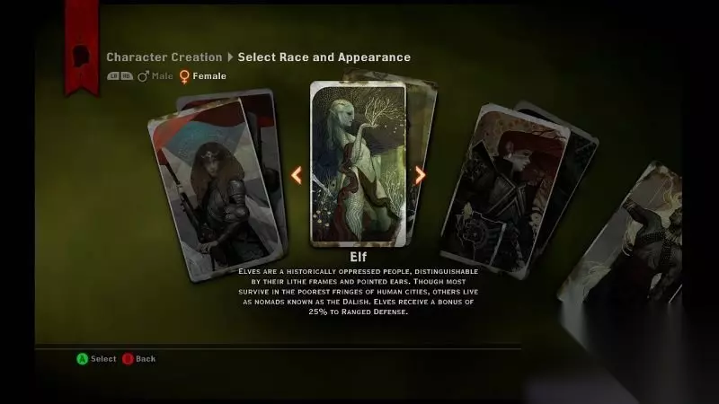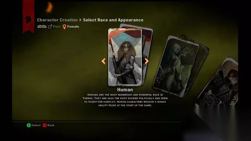 f. 账户设置: 分享用户数据:这能够让EA收集你的游戏数据以完善《龙腾世纪:审判》的产品服务; 让我保持登陆:自动与EA服务器相连接,初次使用EA服务器的XBOXlive用户的live账号会自动关联EA服务器并生成出EA账号; 上传游戏数据至“龙腾世纪主页”:将玩家的故事选择、角色信息都上传至龙腾世纪主页网站之中; 2. 种族选择界面介绍: 开始新游戏后首先需要选择种族,一共有3个种族,需要注意的是本作中每个种族都有其额外加成的效果,选择种族就相当于是选择额 外的奖励。 a. 人类: 在瑟达斯大陆上,人类的数量最为庞大,他们的实力也非常强劲。 然而他们并不团结,人类早已分了好几个派系并且互相冲突。人类角色可以在游戏开始时得到额外的技能点。