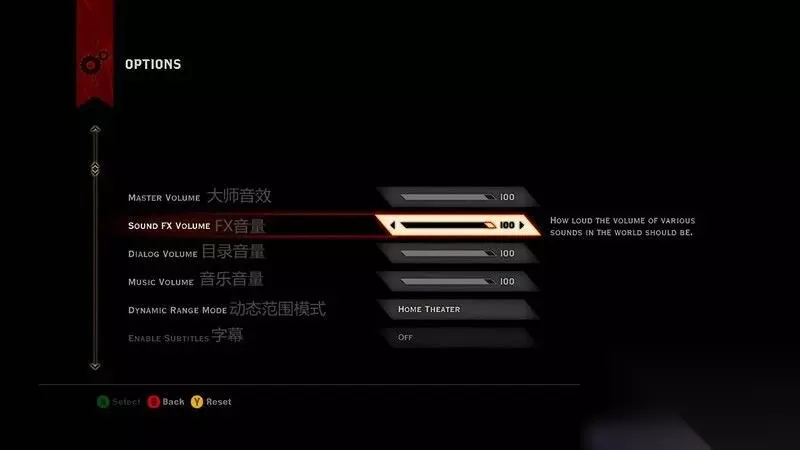 d. 音频设置: 大师音效:控制游戏整体的音量; FX音量:控制游戏世界背景音量; 目录音量:控制游戏目录音量; 音乐音量:控制游戏背景音乐音量; 动态范围模式:改变音效(如家庭影院风格); 字幕:开启或关闭字幕; 文字语言:设置字幕及目录语言; 语音语言:设置对话的语言;