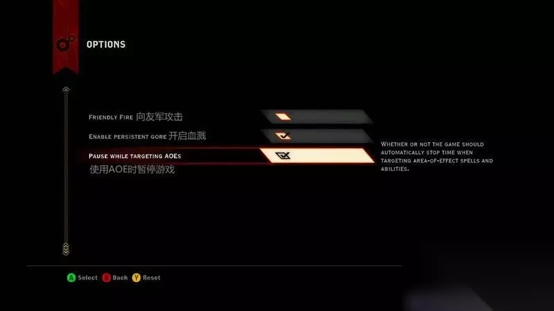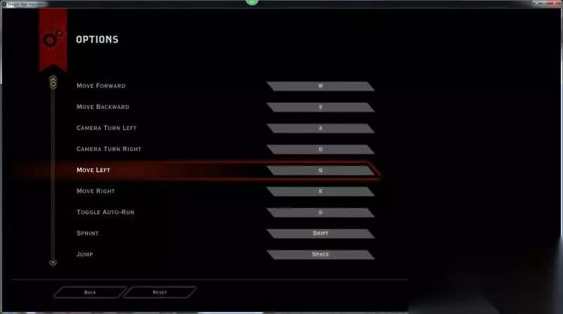 2. PC键位: WASD:移动键; G:开启自动奔跑模式; Shift:冲刺; 空格键:跳跃; F:互动; V:搜索; Tab:选择目标; R:基础攻击; Ctrl:暂停游戏; T:战术视角; Y:命令队友攻击目标; H:命令队友停止前进; K:取消之前的一切指令; L:脱离战斗; 数字键:释放相应技能; =:召唤/遣散战马; J:打开壬午日志; I:打开物品菜单; P:打开人物菜单; F1-F4:依次选择队友; F5:快速存档; F9:快速读档。 三、界面介绍: 1. 游戏主界面: New Game - 开始新游戏。 Multiplayer - 和Origin好友进行多人合作游戏。 Load - 载入本地或者云存档。 Option - 各种设置。 Extra - 附加内容,包括如何激活Dragon Keep和预定版宝物等信息。 Quit - 退出龙腾世纪。 a. 基础设置: 向友军攻击:开启了这项,在攻击当中可以伤害到同伴; 开启血溅:开启了这项,在战斗当中敌我受伤都会飞溅血液; 使用AOE时暂停游戏:开启了这项,在单人模式当中使用大范围攻击定位时,游戏会暂停;