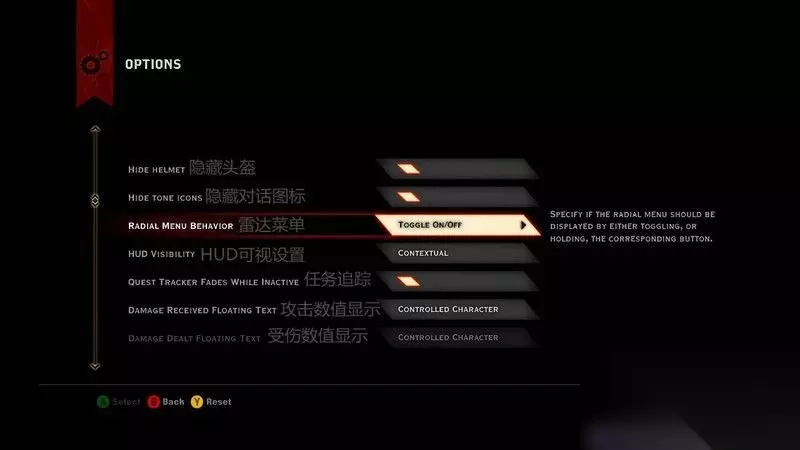 b. UI设置: 隐藏头盔:开启了这项,角色所佩戴的头盔就会消失; 隐藏对话图标:开启了这项,人物在说话时,左屏幕上角的人物头像旁不会再出现对话图标; 雷达菜单:可以将雷达菜单关闭或者是固定又或者是利用键位唤醒; HUD可视设置:开启了这项,显示全员血量、攻击数值、受到伤害数值等各项数据; 任务追踪:开启了这项,只要有任务就会自动为玩家标记任务地点,如果没有任务则不会显示; 攻击数值显示:开启了这项,显示当前控制的角色的每一下攻击伤害; 受伤数值显示:开启了这项,显示当前控制的角色的每一下受到攻击的伤害量; 效果显示:开启了这项,显示当前控制的角色受到效果的情况;