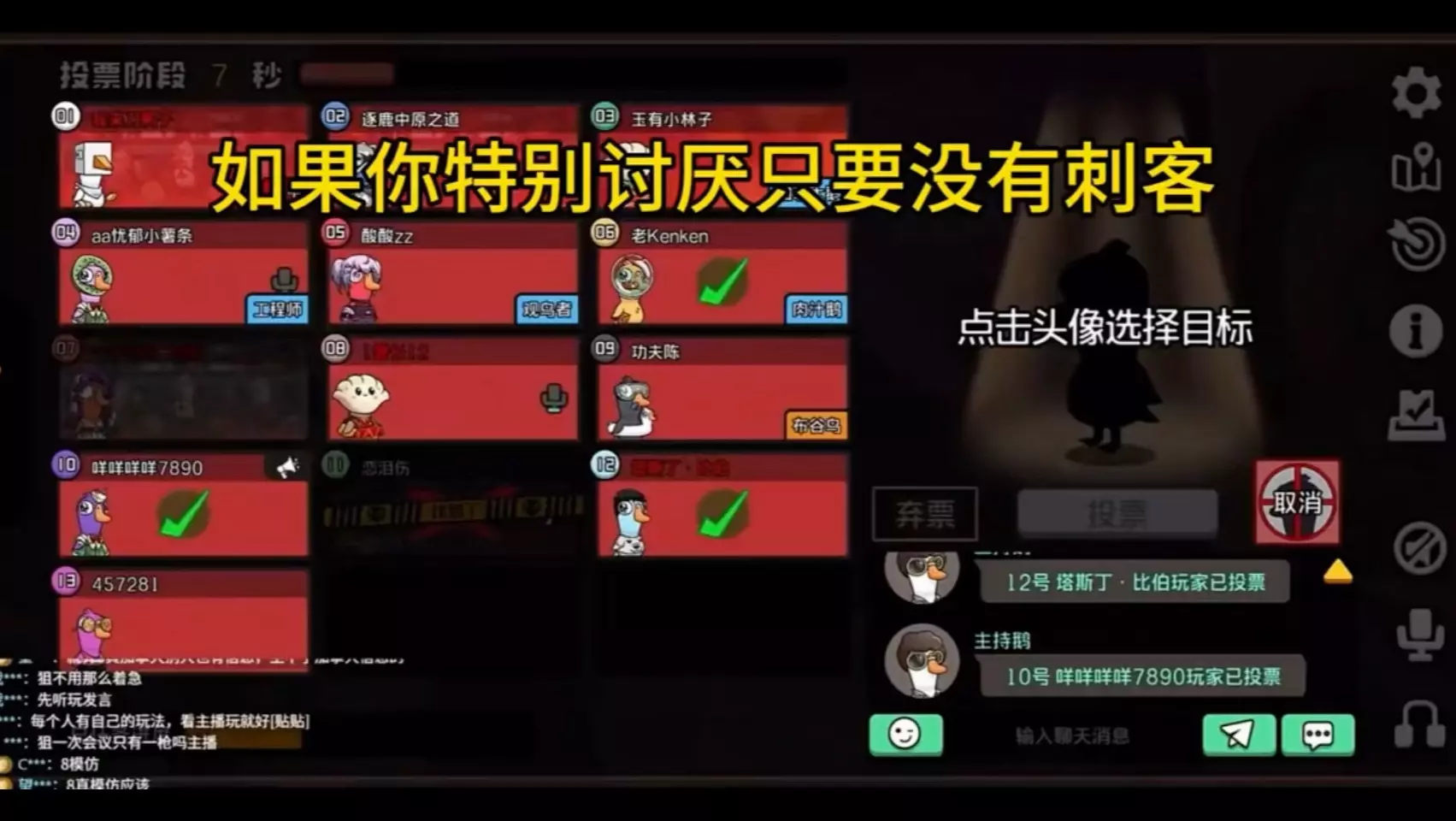 这是《鹅鸭杀》的刺客阵营玩法分享,展示了游戏内的职业选择界面,以及刺客阵营玩家在对局中移动、准备执行击倒操作的过程,教玩家刺客阵营的游玩方式。