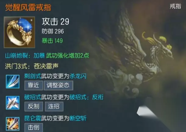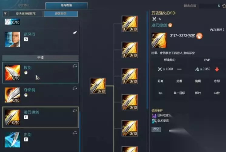 戒指:落剑式+刺剑式+破招式 前2个都是剑术姿态下可用的,落剑式是基础普攻也是稳定回内力的手段,刺剑是的则主要输出,单体最高伤。破招式则是格挡前面的攻击,如果是在敌人攻击前0.5秒施展则可以短暂眩晕御剑。这三个都是核心技能。