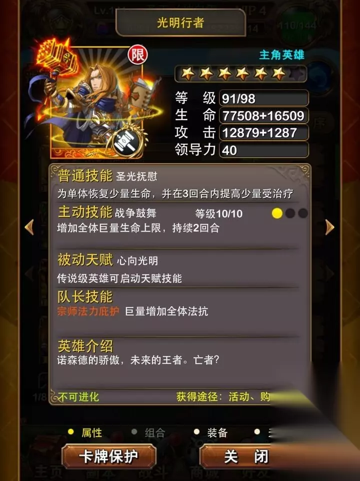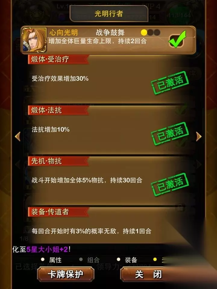 测试1:光明的主动技能加血是固定还是百分比? -------------------------------------------------------------------------------------- 主动技能是增加全体巨量生命并持续2回合,先机物攻是每回合增加5%的物抗 持续30回合,不叠加,装备武器又3%的概率 无敌,这个基本可以无视 本次测试重点测试的是巨量全体加生命到底是加固定值还是加百分比呢? 首先我要跟大家说的是这个是加百分比,小版用一张500级的血量去打副本 被怪打1000血就死掉了,那么我们基本可以排除了加固定血量的可能 一个英雄卡,固定的话只加500不到的上限,只要是有头脑的人都不会信吧? 我们那么就可以得出是百分比加成,那么到底加多少百分比呢?这直接影响着 这个卡的未来走向,那么就跟小版一起深入了解下吧。 首先测试属性是
