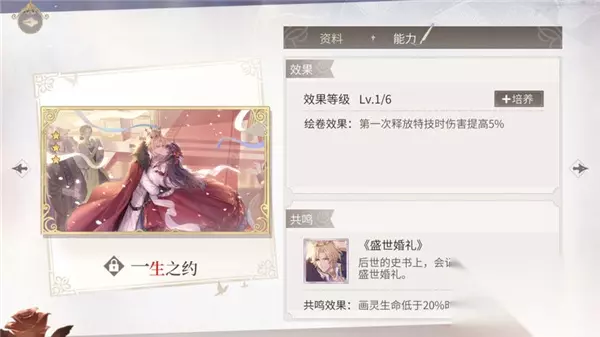 效果等级Lv.1/6 绘卷效果:第一次释放特技时伤害提高5% 共鸣-《盛世婚礼》 后世的史书上,会记下属于我们的这场盛世婚礼。 共鸣效果:画灵生命低于20%时获得一次回复。