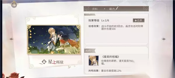 效果等级Lv.1/6 绘卷效果:战斗开始的前3回合,画灵攻击时附带额外伤害500 共鸣-《星辰的祝福》 在晴夜的原野,漫天星辰为我们降下祝福。 共鸣效果:暴击伤害提高12%